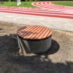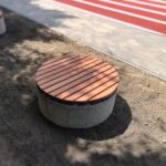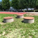 Szkoła Podstawowa w Pogrzybowie – betonowe, okrągłe ławki.